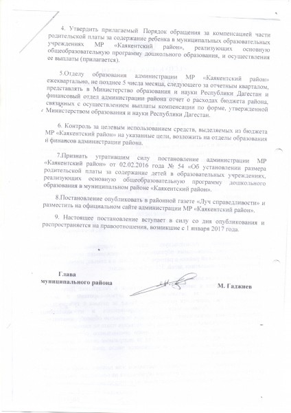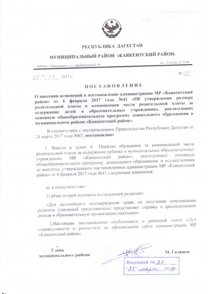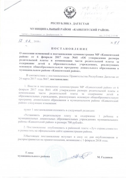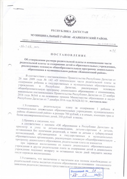 Документ об установлении размера платы, взимаемой с родителей (законных представителей)